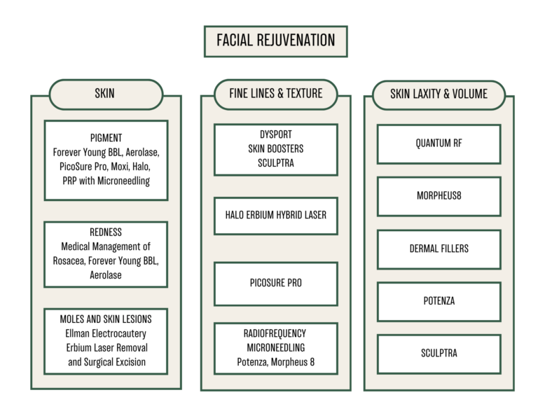 Sometimes, our skin condition is not easily controlled or life factors have not allowed us the time, resources or emotional capacity to seek care. Some patients do not know where to start or who to trust. For whatever the reason, the most common concerns in facial rejuvenation are regarding fine lines, wrinkles, pigmentation, redness, volume loss and skin laxity. In order to meet the needs of our most common patient needs, Dr. Khurana has curated a collection of treatment options and first in class technology that can address your needs and cater to every skin type and demographic at any stage or age of your life.